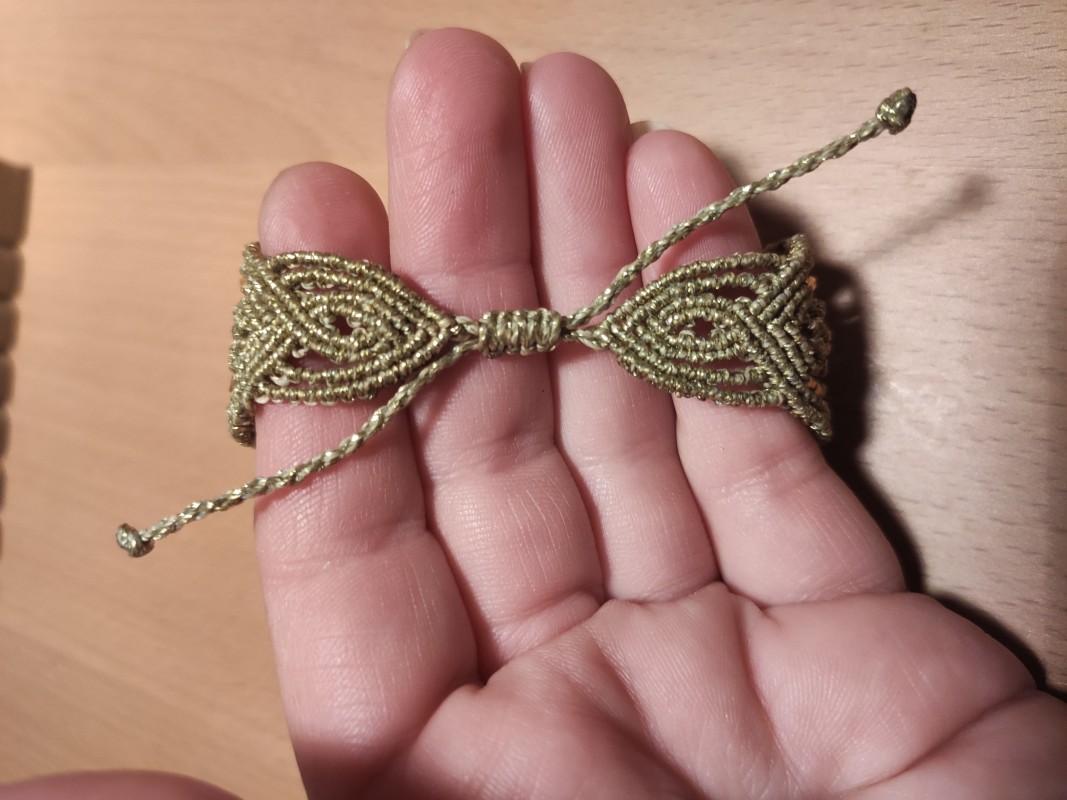 Poi ridurremo la larghezza del braccialetto. A tale scopo, lasciate fuori il filo più alto su ciascun lato. Ripetete quindi una fila completa di nodi macramé su ogni lato.
