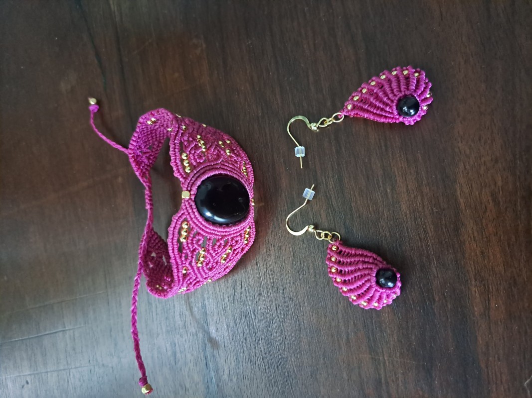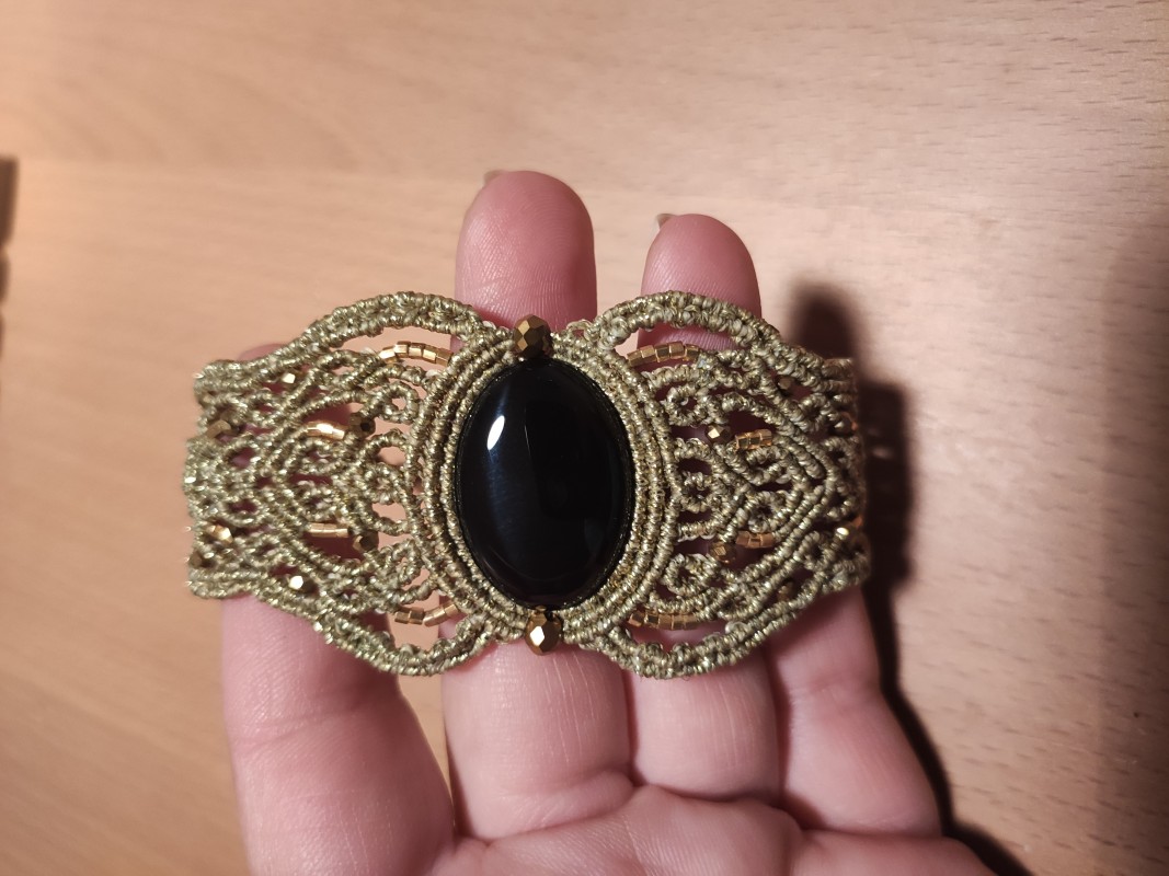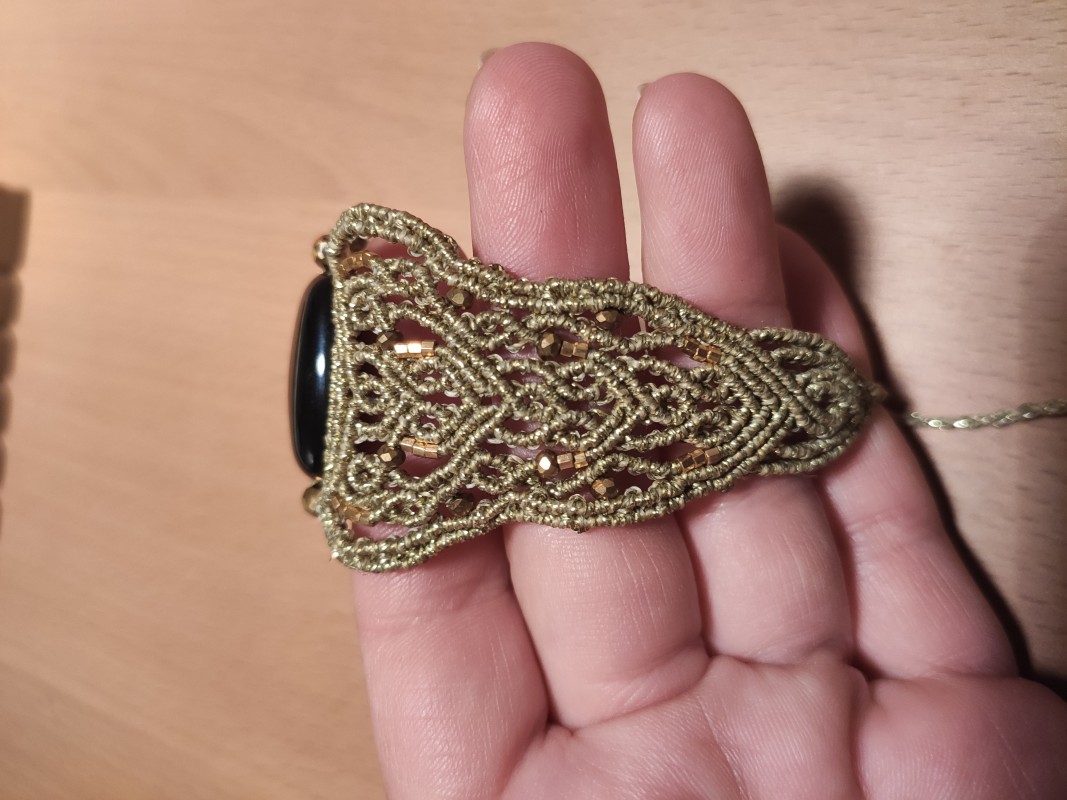 Successivamente, prendete i due fili centrali e infilate una perlina d'oro, mantenendo i fili nella stessa direzione, cioè dall'alto verso il basso. Continuate poi con un'altra fila completa di nodi macramé verso il fondo. Non dimenticate di arrivare fino alla fine, prendendo anche il filo dalla perla. Procedete allo stesso modo su entrambi i lati, prendendo i due fili centrali e annodandoli per fissare la perla.