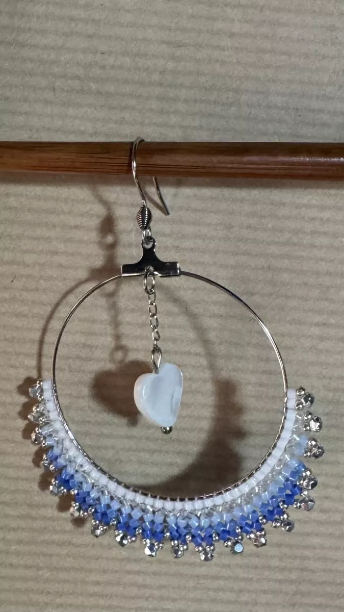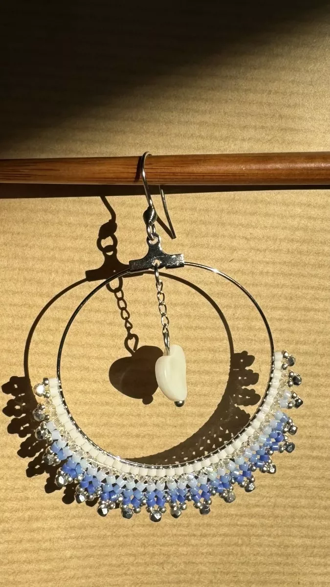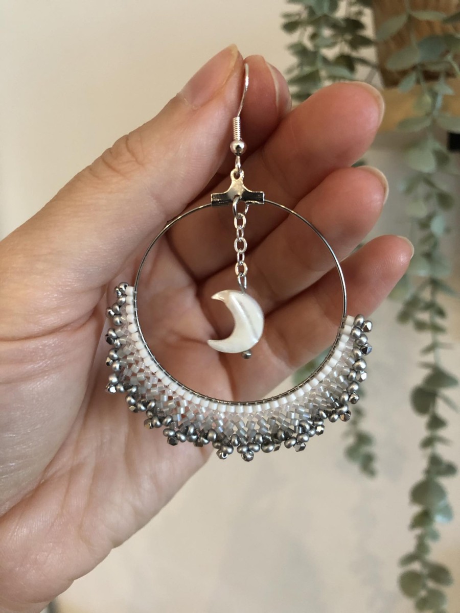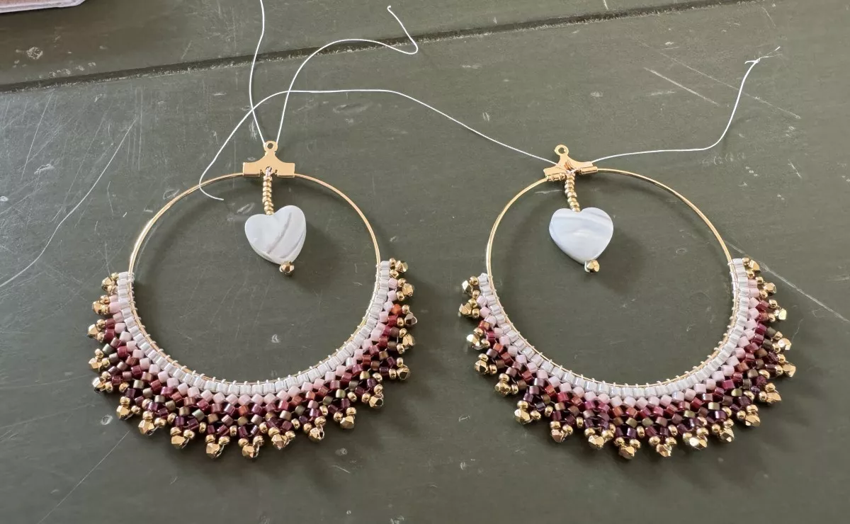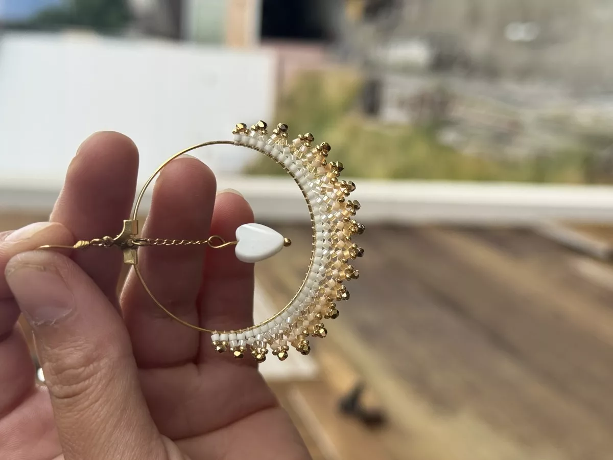 Raddrizzare l'estremità del filo sul retro della creola con una pinza piatta per evitare che la creola si apra durante la tessitura. Tagliare circa 1,5 m di filo fireline da 0,10 mm e infilarlo in un ago misura 12. Fare un doppio nodo sulla creola nel punto in cui si vuole iniziare a tessere. Conservare 20 cm di filo. Per realizzare la prima fila di punto mattone, infilare due perline DB-0352 e passare l'ago sotto la creola per farlo uscire dal centro. Passare quindi l'ago di nuovo attraverso la seconda perlina infilata. Stringere bene per mettere le perline perpendicolari alla creola. Passare nuovamente l'ago attraverso la prima perlina, poi attraverso la seconda e stringere per raddrizzare le due perline.