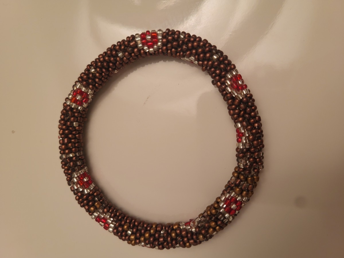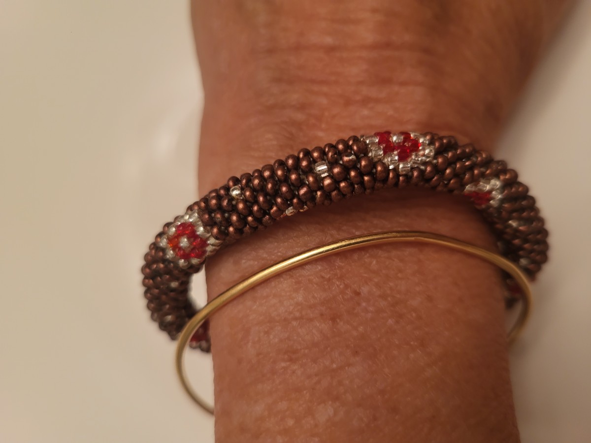 Per iniziare il vostro braccialetto, dovrete infilare 13 sequenze (colonna di numeri) dall'alto verso il basso, per ottenere una spirale lunga 18 cm. Se avete bisogno di un braccialetto più grande, infilate 14 sequenze. Si noti che questa spirale può essere agganciata a una maglia fusa.