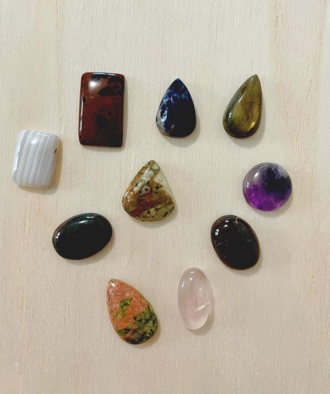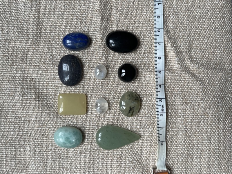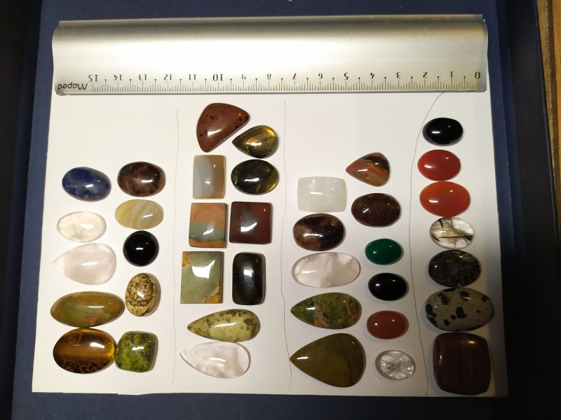 Pour ma part j'ai eut 10 cabochons, (7 "ovale", 2 "goutte", 1 "carré"), respectant les tailles annoncées.