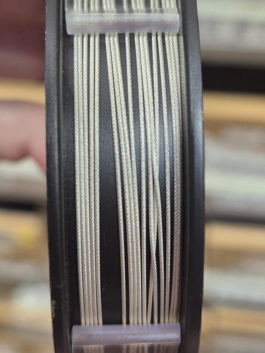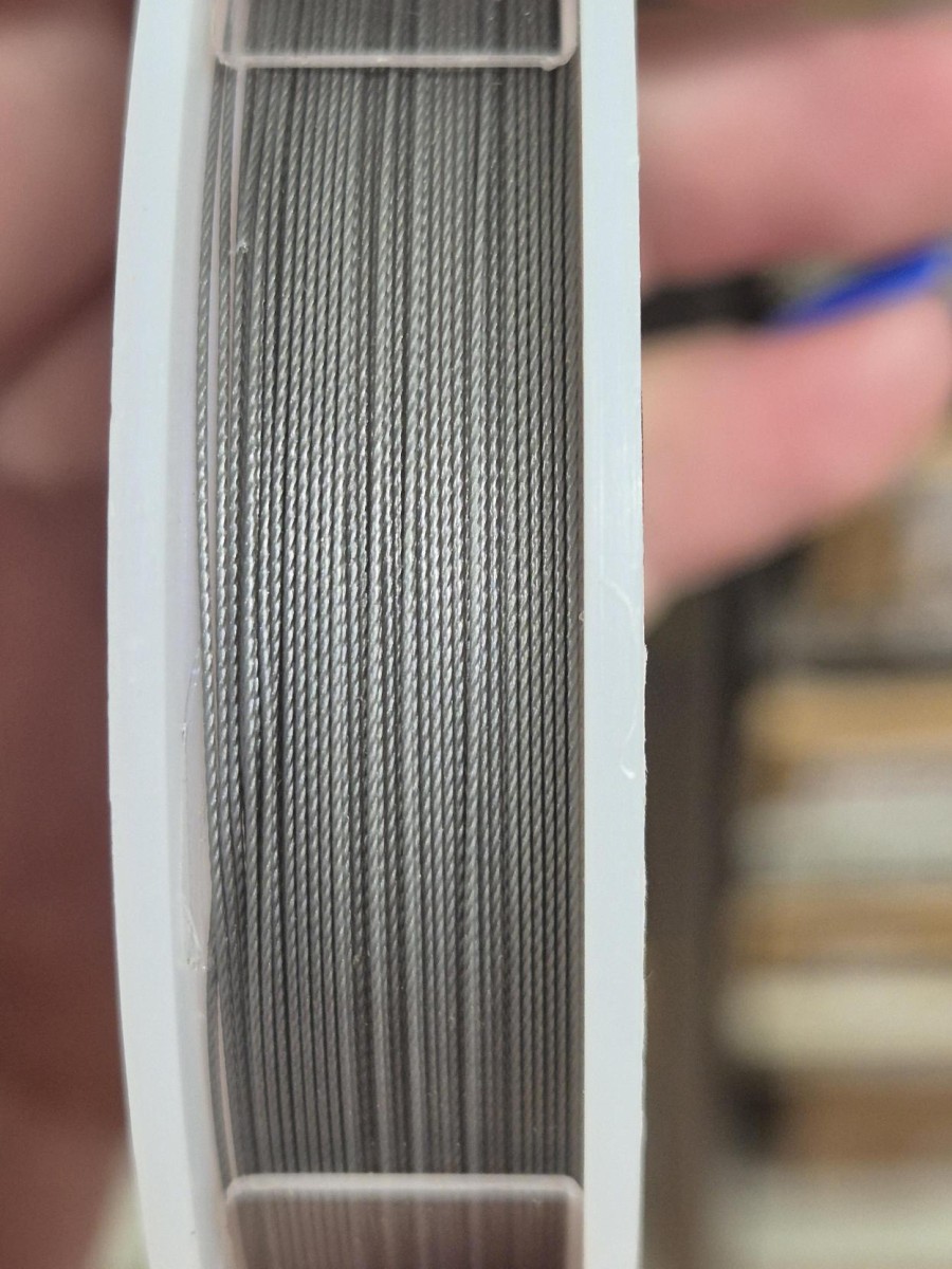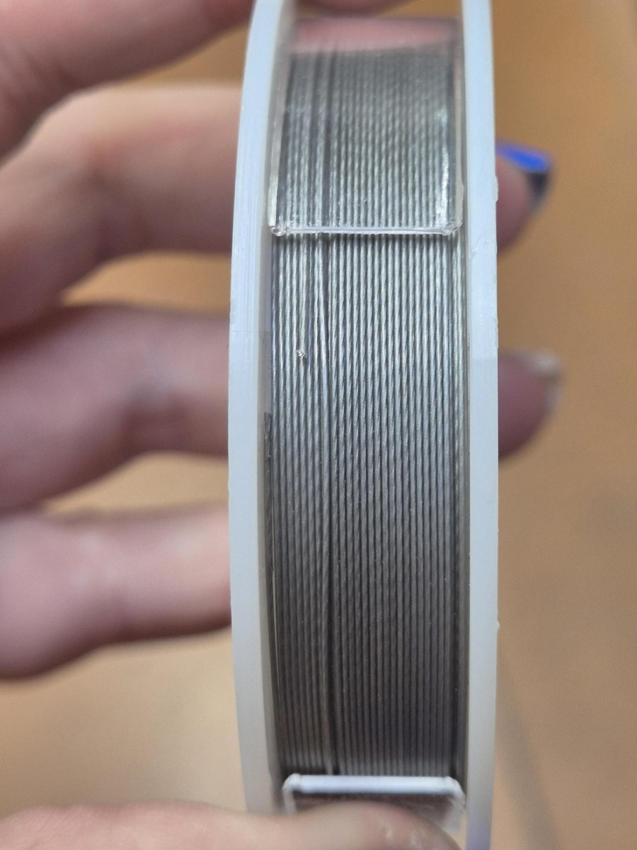 Questo filo flessibile è composto da 21 fili di acciaio inossidabile microtessuti, intrecciati tra loro e ricoperti di nylon. È abbastanza flessibile da poter essere annodato.