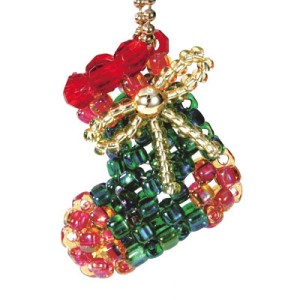 Questo kit Miyuki contiene tutto il materiale necessario per realizzare statuine di perline come questa calza di Natale: perline di semi, filo, perline di vetro, anello per appendere e istruzioni.
