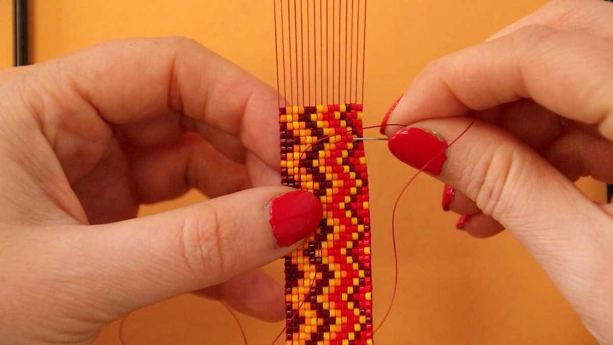 Tagliare una lunghezza del braccio di filo e infilare il filo nell'ago. Il fissaggio del filo nell'armatura si esegue nello stesso modo in cui si ferma il filo nell'armatura. Passare l'ago attraverso una delle file di perline dell'intreccio senza iniziare dal bordo. Con il dito sollevate l'intreccio, in modo da distanziare le perline e far passare l'ago all'interno di una fila di perline. Estrarre l'ago qualche perlina prima del bordo. Passare attraverso una nuova riga nello stesso modo. Tenere l'estremità del filo in modo che non scivoli quando si tira il filo attraverso l'intreccio. Eseguite questa operazione per quattro o cinque volte, quindi tornate all'ultima fila di perline intrecciate e continuate la tessitura.