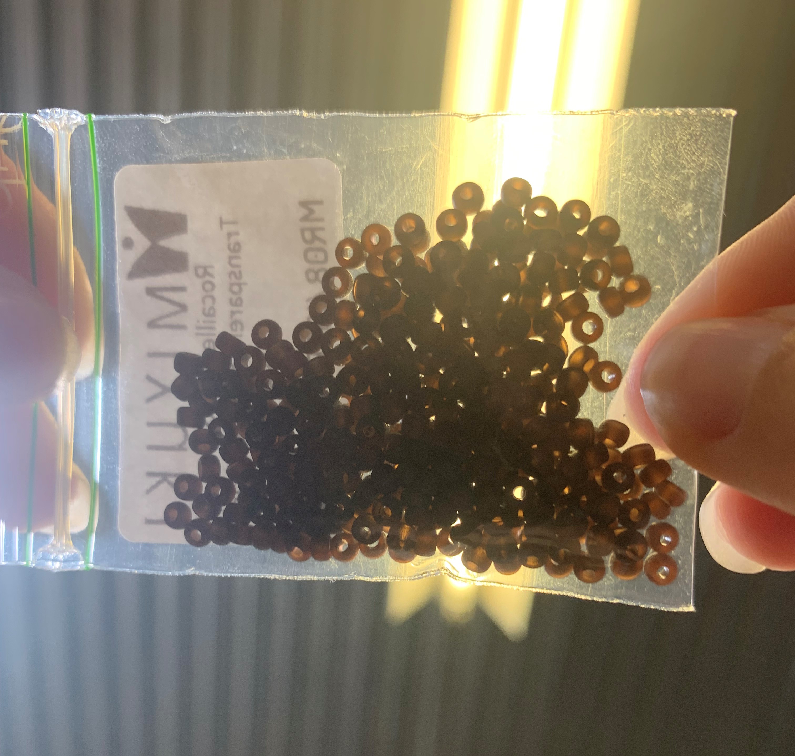 Queste perline di vetro del marchio giapponese Miyuki sono perline di dimensioni 8/0 (circa 2,2 mm in direzione del foro, 3 mm di diametro).