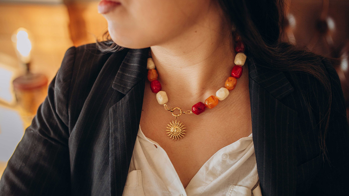 I colori della collezione sono caldi e ricordano gli anni Settanta: kaki, terracotta e rosso scuro. Queste tonalità terrose sono anche molto di moda quest'anno. Infatti, il colore dell'anno 2025 è Mocha Mousse, secondo lo specialista dei colori Pantone. Si tratta di un insieme di tonalità marroni morbide. Questi colori rassicuranti si abbinano perfettamente ad abiti professionali come camicette e blazer. Per le più audaci, un tutorial di collana stravagante mescola forme diverse di perle e colori più vivaci per un look originale e artistico.