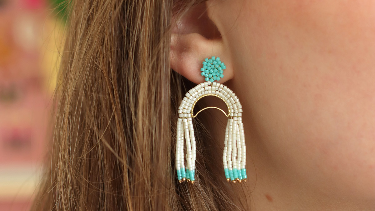 Orecchini pendenti Miyuki che tessono l'arco circolare finale indossato