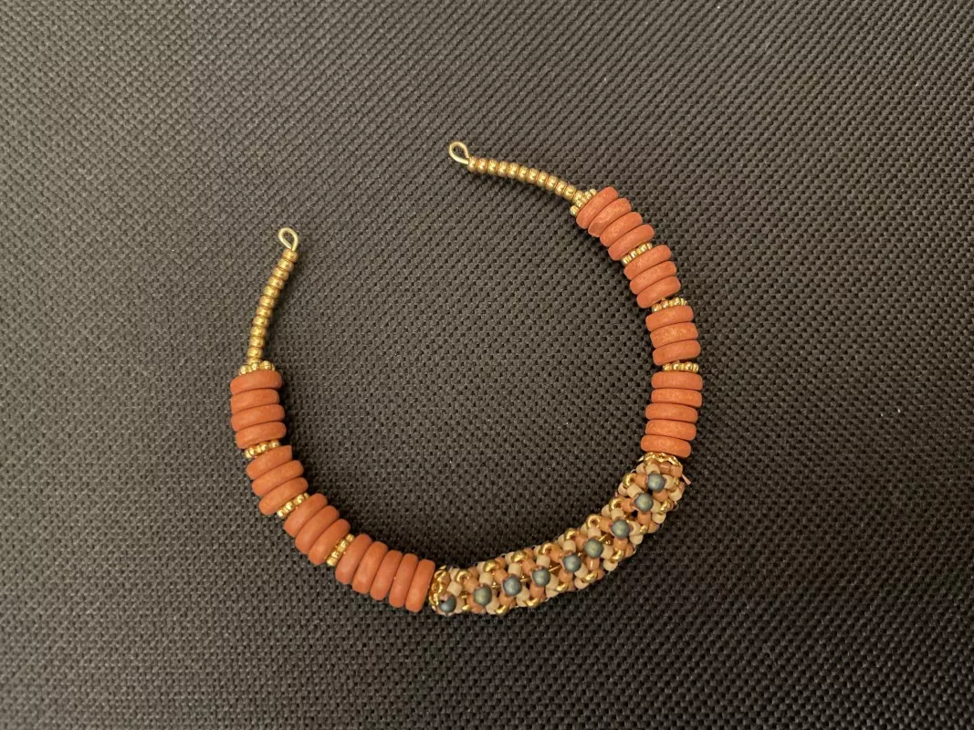 Il tubo di perline realizzato con questa tecnica è montato su un filo di memoria con un diametro di 65 mm. Il filo di memoria è un filo che riprende forma quando viene allungato e rilasciato. Devi tagliarlo con un paio di tagli poiché è molto duro e rischi di danneggiare le lame dei tronchesi. Allo stesso modo per le pinze tonde, scegline una solida.
