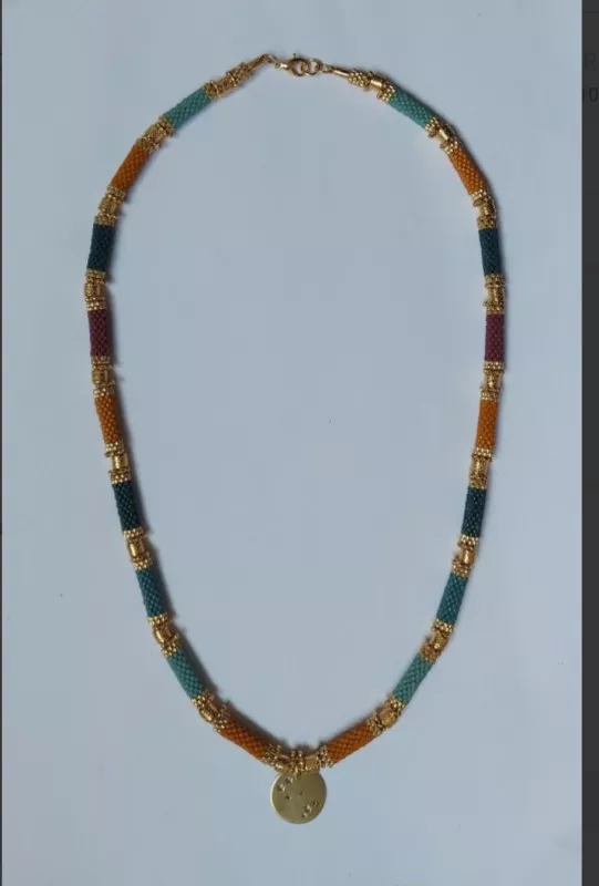 Infilare le seguenti perline sul cordone. Tra ogni tubo c'è un disco di fiori, un tubo d'oro e un disco di fiori. Al centro, il ciondolo è anche incorniciato dalla stessa sequenza di anelli di fiori e tubi d'oro. Finisci con l'attacco della perlina d'oro mostrato al punto 14-15. Tagliare il cordone a 5 mm e incollare il tappo finale al cordone e al tubo di perline d'oro.