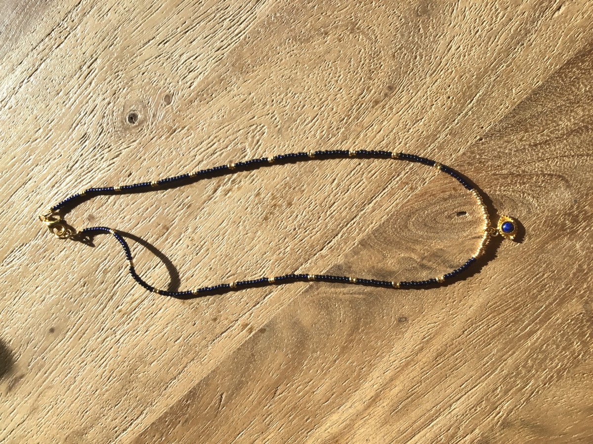 Per la collana piccola, tagliate un filo di 50 cm. Se hai un collo largo, usa più filo. Provatelo intorno al collo prima di tagliarlo. Avete bisogno di almeno 15 cm in più per la finitura. Infilare 1 crush bead, 1 parafilo, passare l'anello chiuso e far passare il filo di nuovo attraverso il crush bead.