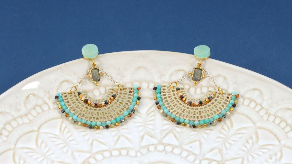 Questi orecchini alla moda sono fatti di amazzonite, labradorite e un mix di piccole perle di vetro Miyuki delicas. Il mix di tonalità sabbia e turchese si adatta sia all'estate che all'inverno. Stupisci i tuoi amici facendo questi orecchini da solo. Si possono personalizzare con migliaia di combinazioni di colori diversi. Abbiamo una selezione molto grande di perline Miyuki delicas 11/0 a vostra disposizione, così come decine di riferimenti di perline di pietre preziose di 2 mm.