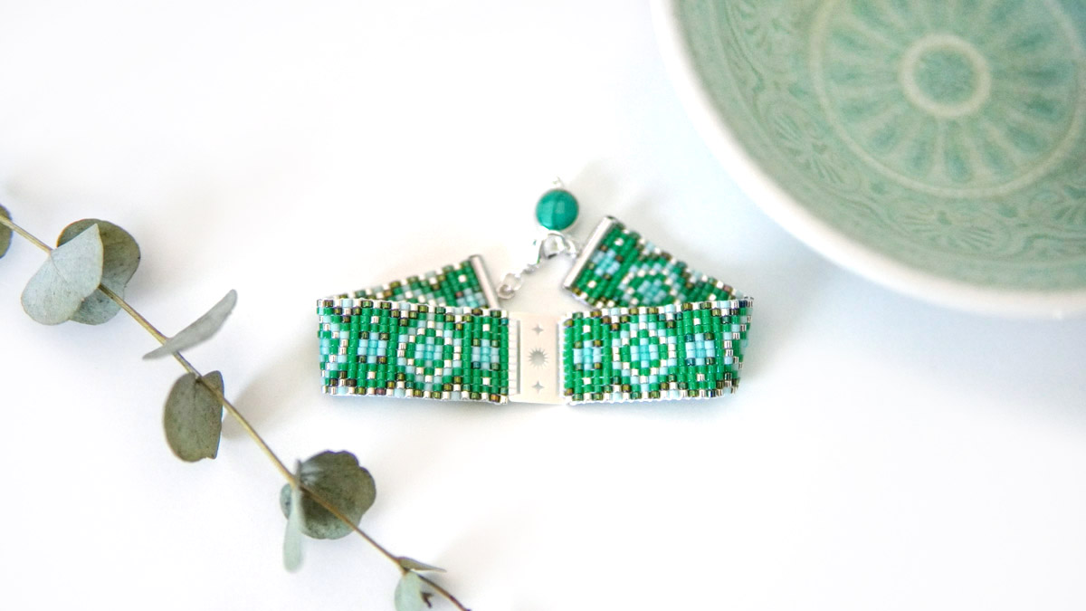 Realizzare due pezzi identici di tessuto a telaio. Questi due pezzi verranno successivamente fissati al distanziatore. Per realizzare questi intrecci, attaccate i 13 fili al telaio come di consueto e tessete come se doveste realizzare l'intero braccialetto.