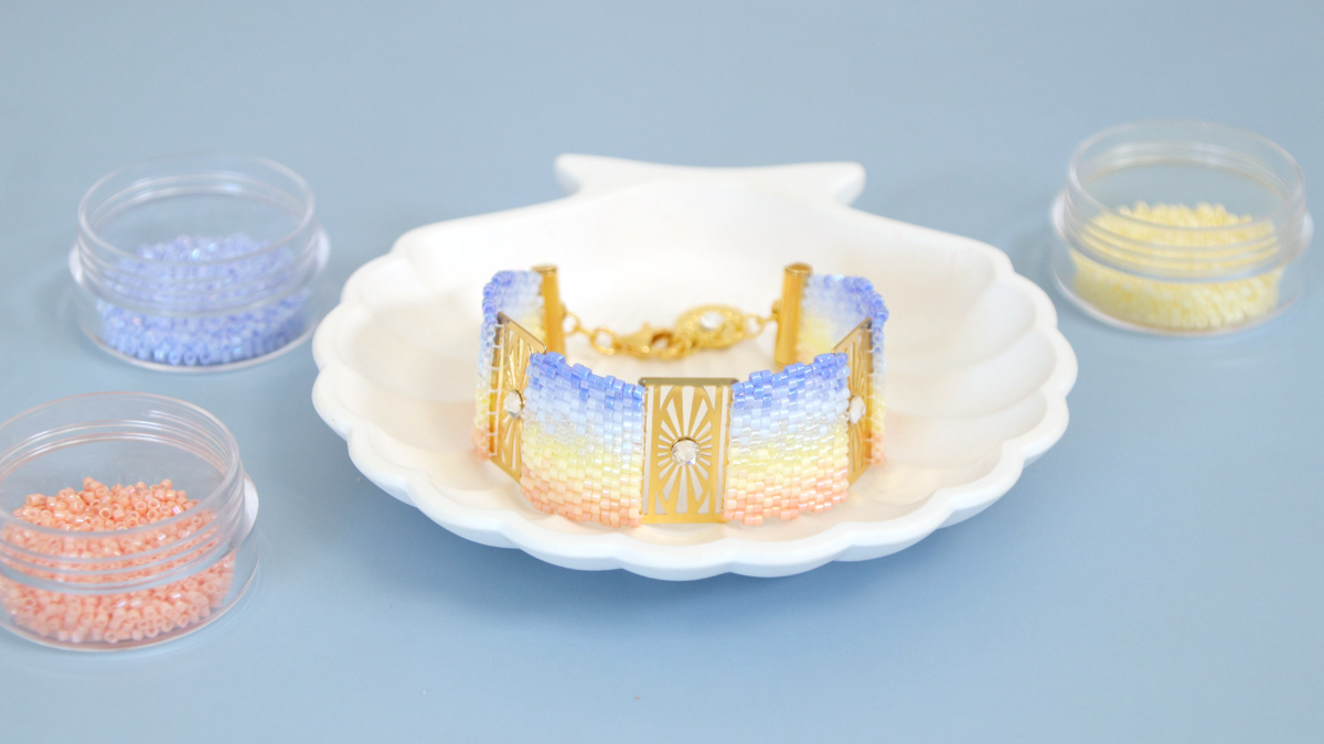 Per questo braccialetto abbiamo utilizzato 8 colori di perline Miyuki delica per creare una gradazione nei colori dell'alba. Questi bellissimi colori possono essere utilizzati per creare un braccialetto o altri gioielli con i colori dell'alba. Non esitate a mostrarci il risultato sui social network taggandoci. @perlesandco su Instagram e @Perles & Co su Facebook.