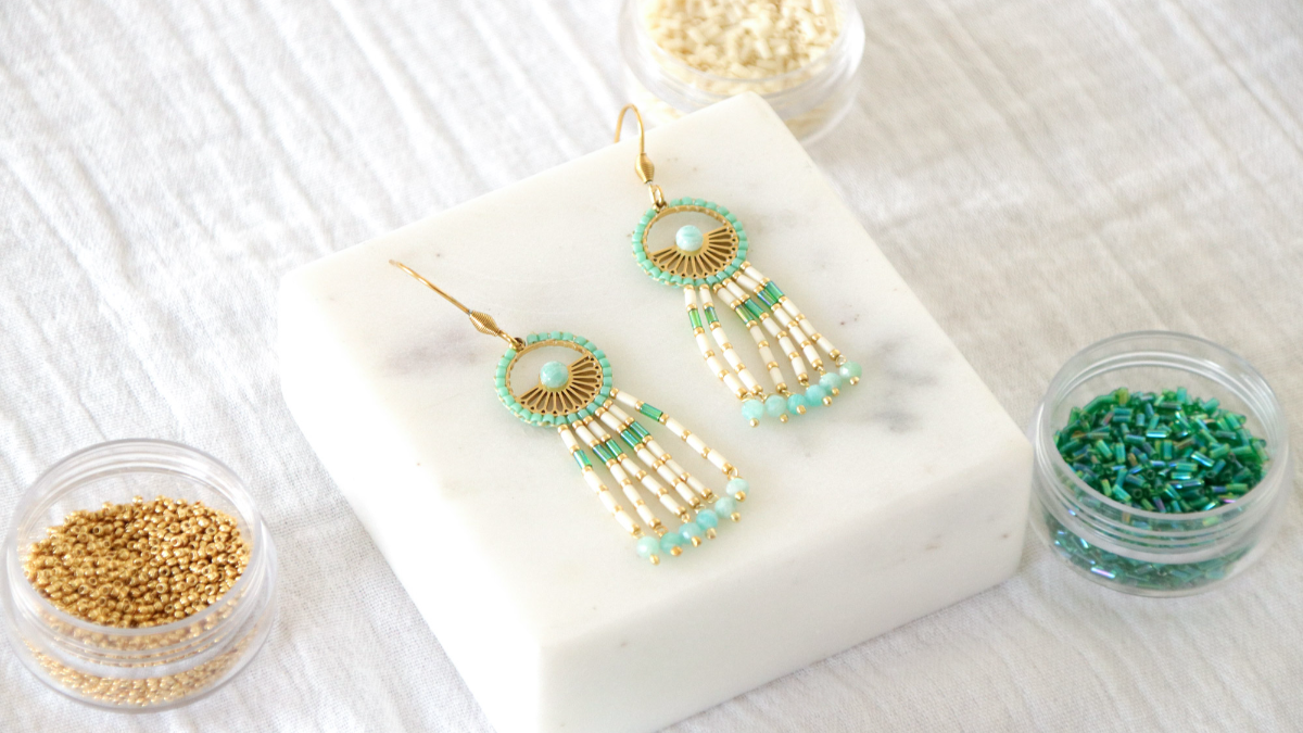 Tagliare 1 m di filo per tessere e legarlo al ciondolo vicino alla chiusura. Conservare 10 cm dell'estremità del filo. Infilare il pezzo di filo più lungo sull'ago. Infilare due perline turchesi e posizionarle contro il nodo e contro il ciondolo, ma verso l'esterno del ciondolo. Passare il filo con l'ago intorno al bordo del ciondolo e di nuovo attraverso la seconda perlina, facendo attenzione alla direzione. Stringere.