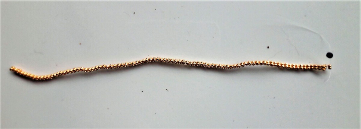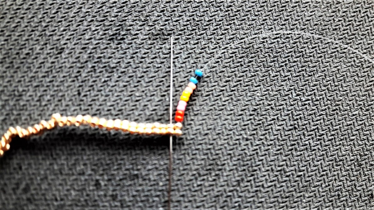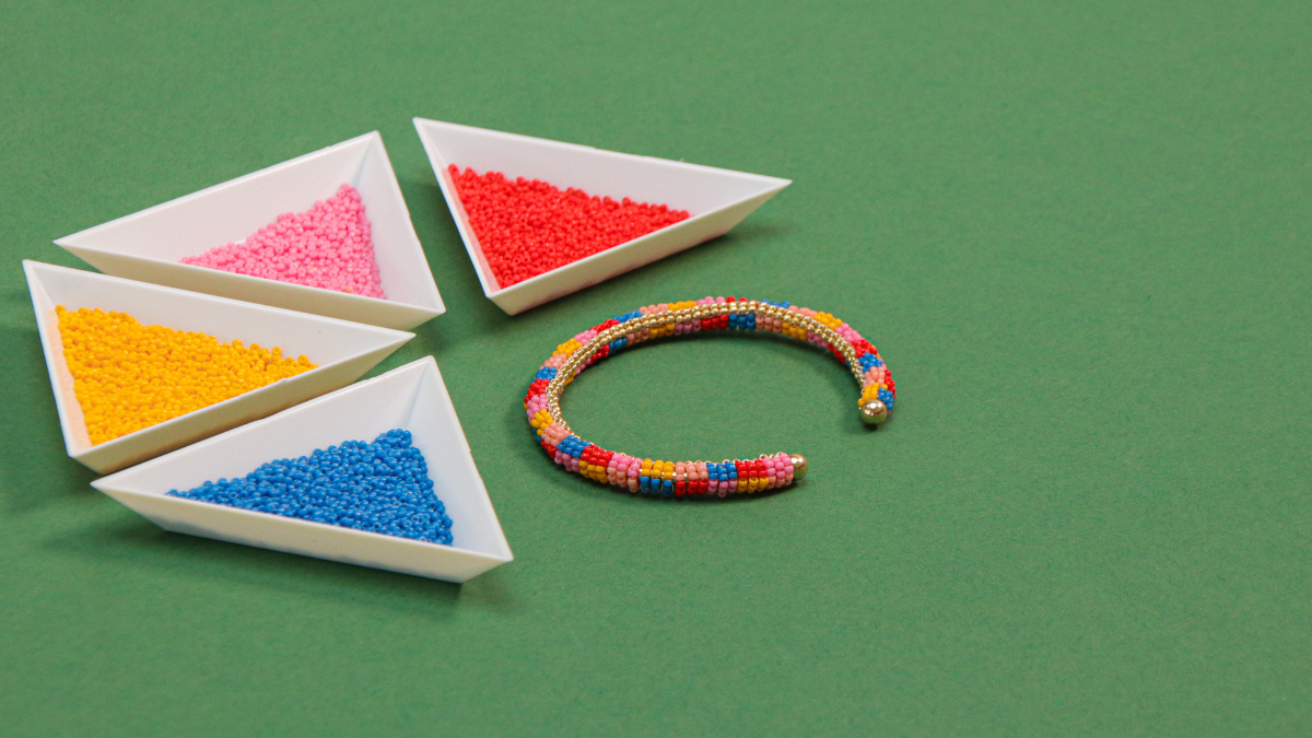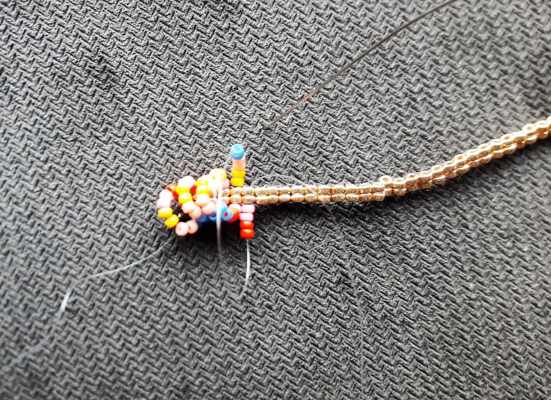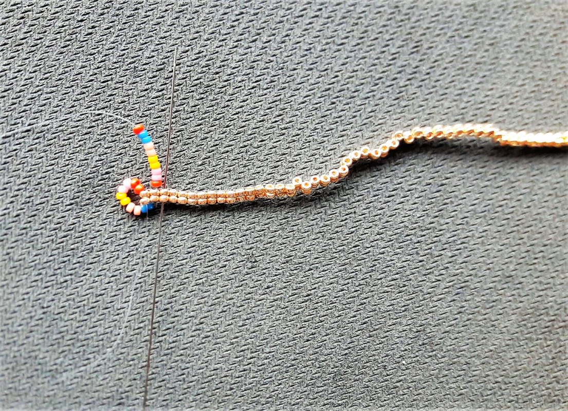 Terminare la manica dopo aver fatto l'ultimo giro: per sicurezza, far passare il filo lungo la banda di perle dorate per qualche riga. Quindi fermate il filo facendo un nodo da chirurgo e facendo passare la coda del filo attraverso le perle vicine prima di tagliarlo. Naturalmente, le due estremità della manica devono rimanere aperte per poter far passare il braccialetto.