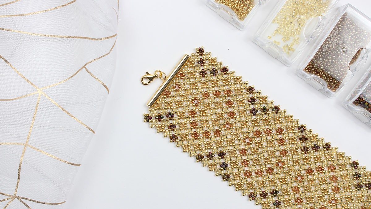 Una delle ultime tendenze è il polsino largo in oro per dare al vostro look un tocco chic. La nostra partner creativa Alice Gerfault si è unita a noi per insegnarvi a realizzare un polsino largo utilizzando il punto pondo. Per coloro che non conoscono questa tecnica di tessitura, abbiamo una scheda informativa "Come fare il punto pondo" che vi spiegherà meglio questo modo di tessere le perline.