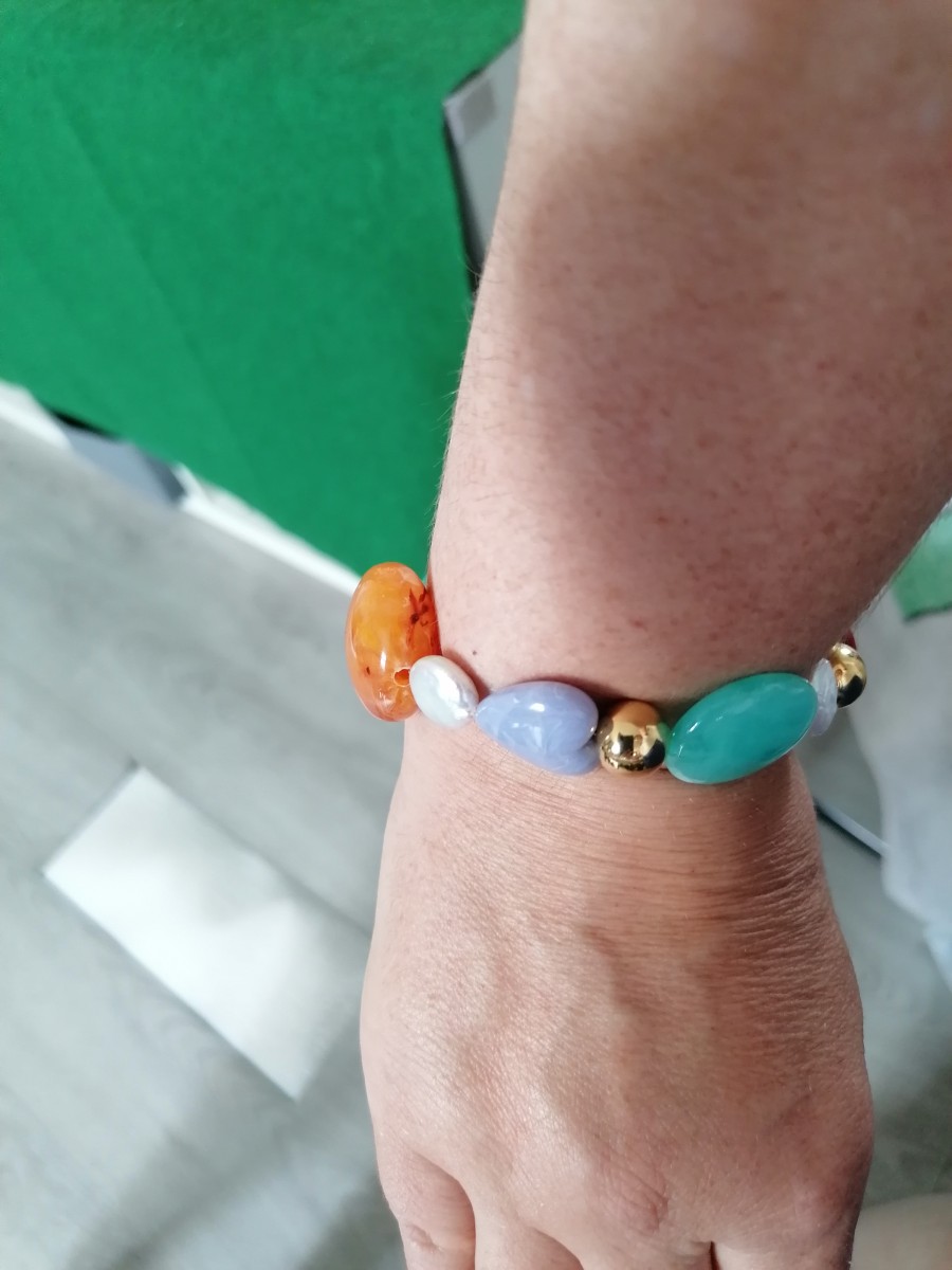 Questo bracciale estivo è stato progettato per aggiungere un tocco di freschezza e raffinatezza al vostro polso. È composto da una varietà di perle: le perle piatte d'acqua dolce aggiungono un tocco di morbidezza e raffinatezza, mentre le perle turchesi, pesca, bordeaux e malva danno un tocco di colore brillante ed estivo.