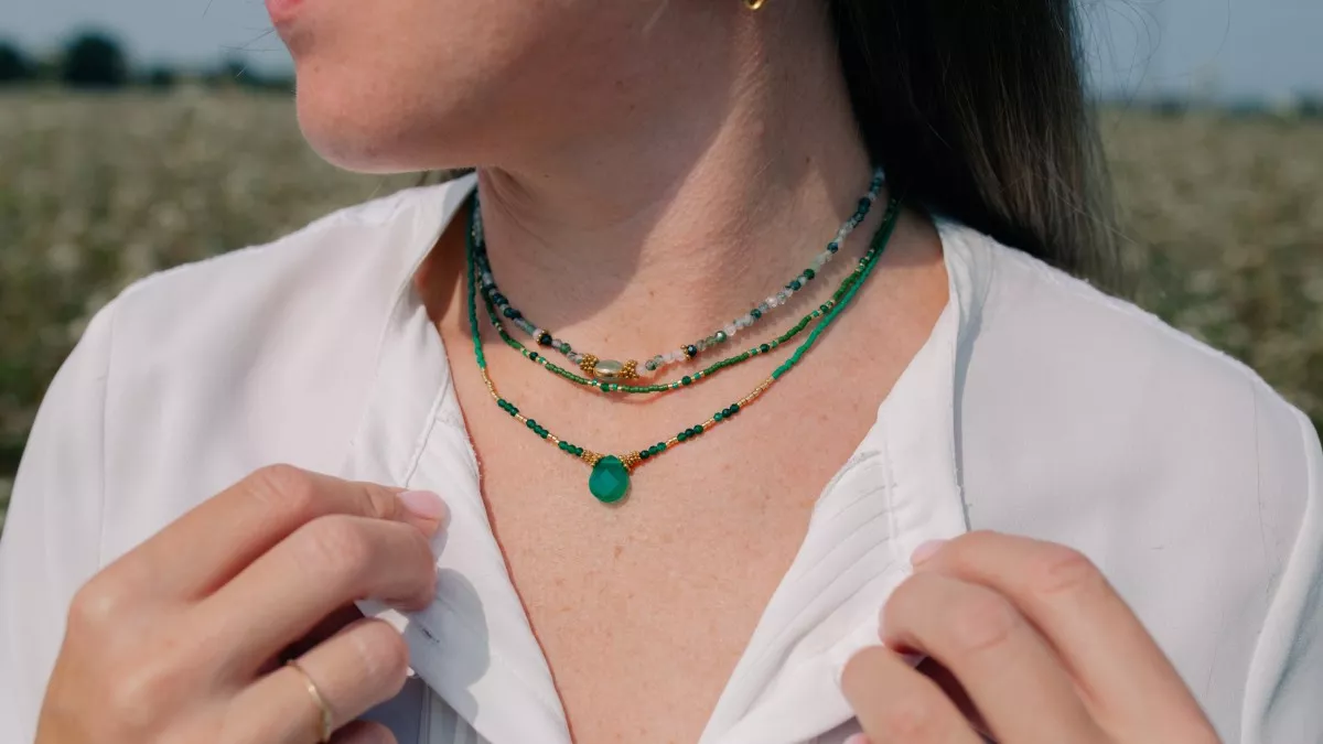 La prima collana è una delicata composizione di Agata Mousse, impreziosita da una perla di avventurina. Il tutto è incorniciato da anelli floreali in acciaio inossidabile placcato oro. Le tonalità verdi dell'Agata Mousse ricordano i paesaggi boschivi. La seconda collana è composta principalmente da perline Miyuki Delica 11/0 nei toni del verde e dell'oro, che si fondono armoniosamente con perline di giada colorata. Questa collana è più sottile e delicata, in modo da integrarsi armoniosamente con le altre due collane. La terza collana ha un pendente in onice verde, posto al centro della collana. Incorniciato da anelli floreali in acciaio inossidabile color oro, questo grazioso pendente verde si abbina perfettamente a una camicetta bianca o floreale.