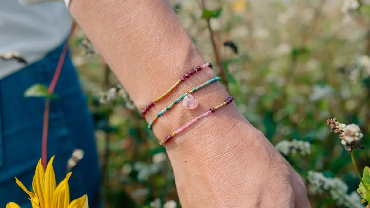 Ho creato una moltitudine di piccoli braccialetti elastici utilizzando pietre naturali pregiate: granato, crisocolla e perline di tormalina rosa. Nelle foto ci sono solo 3 braccialetti, ma con i materiali elencati si possono realizzare in totale da 7 a 9 braccialetti di circa 16 cm. Naturalmente, offriamo un'ampia scelta di piccole perle in pietra semipreziosa. Sentitevi liberi di adattare i colori. Ho scelto il filo elastico Elonga 0,30 mm perché è molto sottile. Le perle hanno un foro di circa 0,5 mm e bisogna riuscire a far passare il filo due volte attraverso le perle con l'ago. È un filo molto elastico, ma non è assolutamente adatto alle perle più grandi e pesanti. Quindi, se cambiate le perline nel tutorial, mantenete le stesse dimensioni. Se volete realizzare braccialetti elastici con perle di pietra semipreziosa più grandi, vi consiglio di seguire il nostro corso per principianti di gioielleria in pietra naturale.