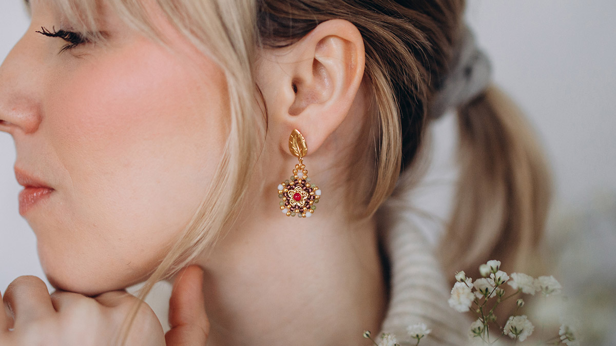 Le perline floreali dorate con cabochon hanno diversi fori, quindi possono essere utilizzate come ausilio per la tessitura. Inoltre, sono bifacciali, quindi si presentano bene su entrambi i lati, il che è perfetto per gli orecchini di perle. La tecnica di tessitura utilizzata non è molto complicata, ma combinando perle di forme e colori diversi si ottiene un gioiello molto elaborato. Questi orecchini in perle e tormalina verde si ispirano a uno stile bohémien chic. La tormalina aggiunge un tocco naturale e accentua il fascino artigianale dell'intreccio. Questa pietra è particolarmente apprezzata per il suo colore vibrante e le sue sfumature sottili, che variano dal verde chiaro al rosa intenso a seconda della luce.