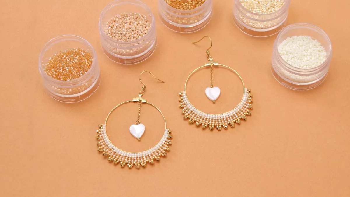 Raddrizzare l'estremità del filo sul retro della creola con una pinza piatta per evitare che la creola si apra durante la tessitura. Tagliare circa 1,5 m di filo fireline da 0,10 mm e infilarlo in un ago misura 12. Fare un doppio nodo sulla creola nel punto in cui si vuole iniziare a tessere. Conservare 20 cm di filo. Per realizzare la prima fila di punto mattone, infilare due perline DB-0352 e passare l'ago sotto la creola per farlo uscire dal centro. Passare quindi l'ago di nuovo attraverso la seconda perlina infilata. Stringere bene per mettere le perline perpendicolari alla creola. Passare nuovamente l'ago attraverso la prima perlina, poi attraverso la seconda e stringere per raddrizzare le due perline.