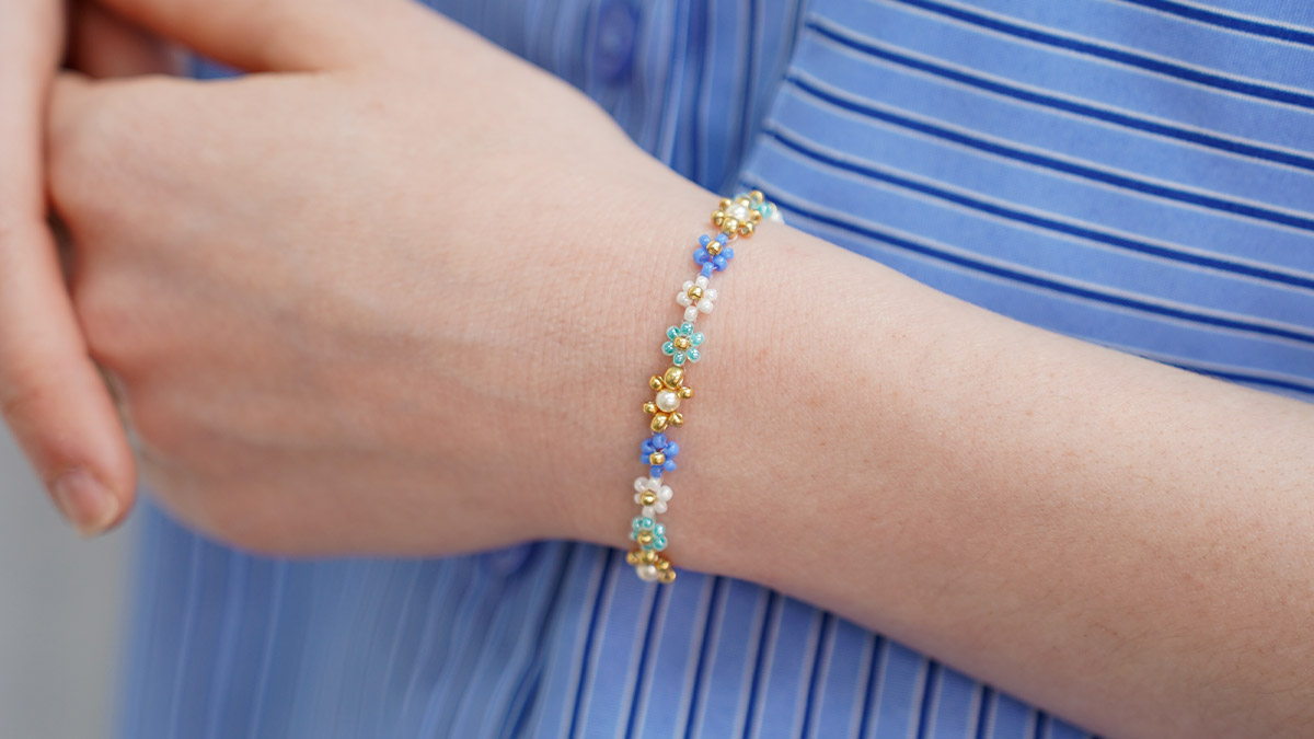 Tagliare 1,5 m di filo di nylon trasparente di 0,20 mm. Infilare una protezione per fili sul filo e posizionarla al centro del filo. Incrociare le due estremità del filo con una perla d'oro. Stringere bene, controllando che i due fili siano della stessa lunghezza.