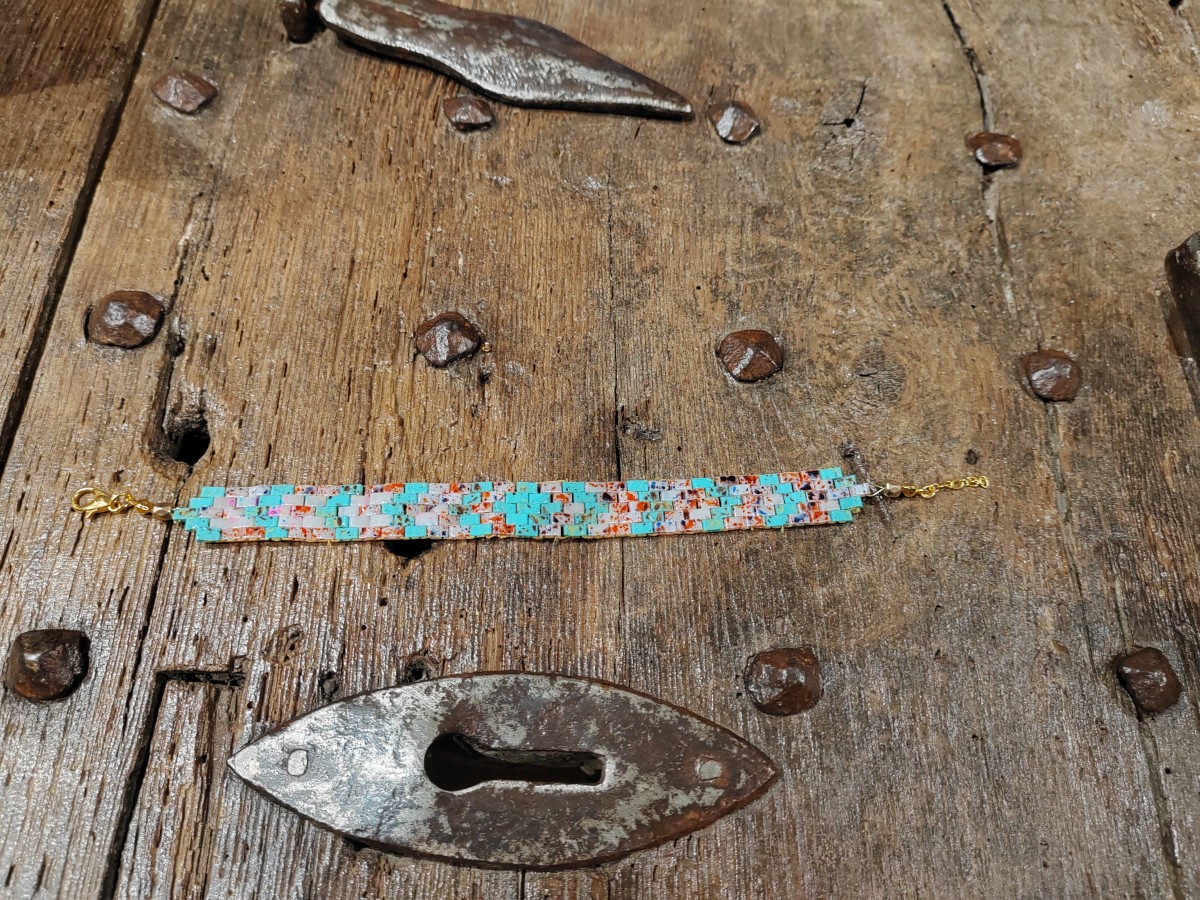 Scoprite il nuovo tutorial per il bracciale di perle Miyuki Half Tila per imparare a realizzare un gioiello fatto a mano che unisce eleganza, finezza e autenticità. Realizzato con perle giapponesi Miyuki Tila, rinomate per la loro qualità e brillantezza, questo bracciale intrecciato a mano presenta un raffinato motivo geometrico in morbide tonalità di turchese, beige e avorio.