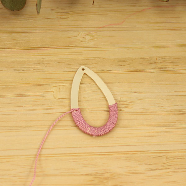 Fare un nodo con il filo di seta sulla goccia traforata e iniziare ad avvolgerla. Una volta terminato, applicare delicatamente un goccio di colla. Una volta asciutto, tagliare il filo in eccesso.