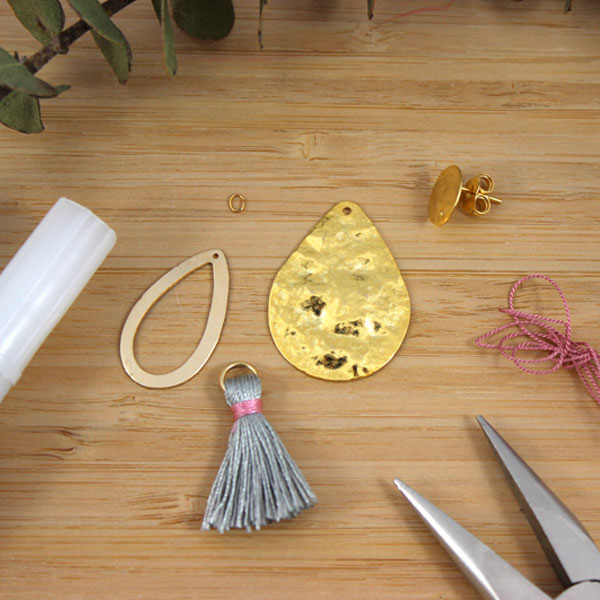 Assemblare l'orecchino infilando la goccia traforata e la goccia martellata sul perno.